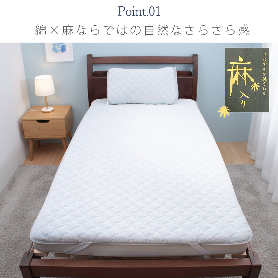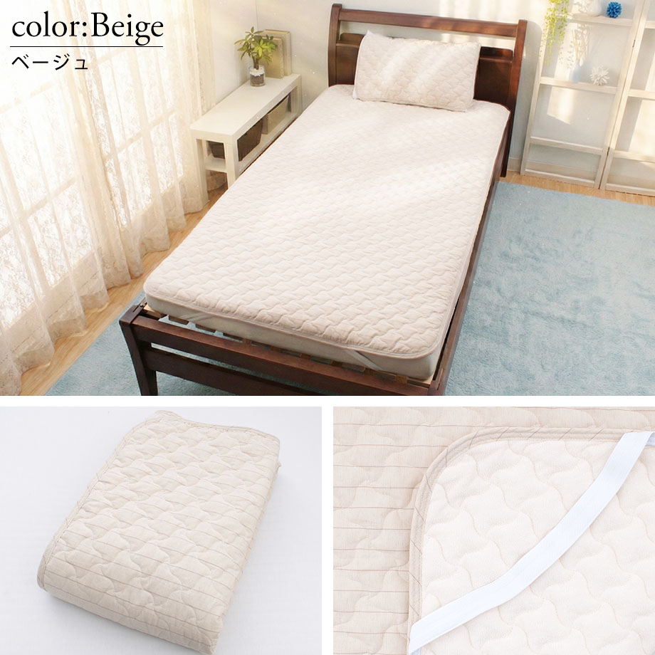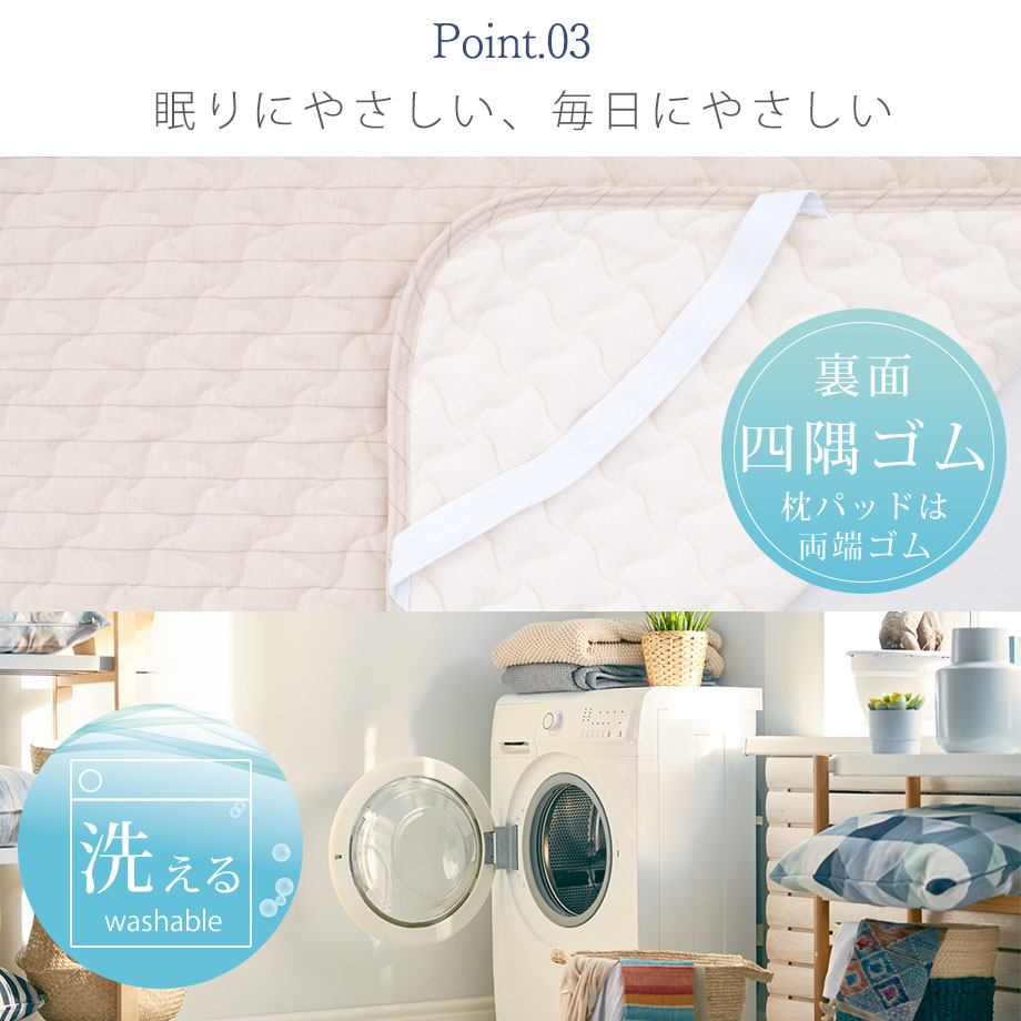 商品仕様/ 四辺ゴム付(枕パッドは両端ゴム付)、洗濯表示に基づきご家庭で丸洗い可能(ネット使用)