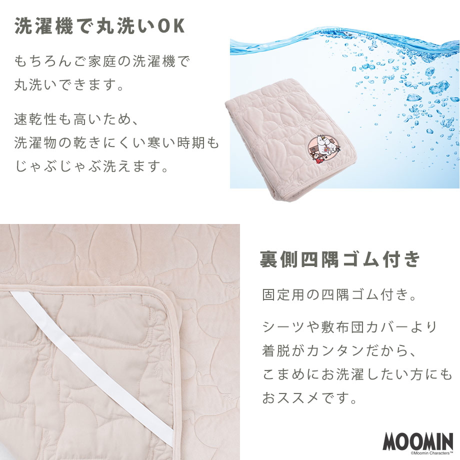 商品仕様/キルト生地、足元刺しゅう入り、四隅ゴム付き、取り扱い表示に従い洗濯可能
