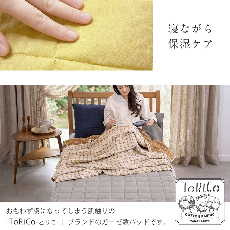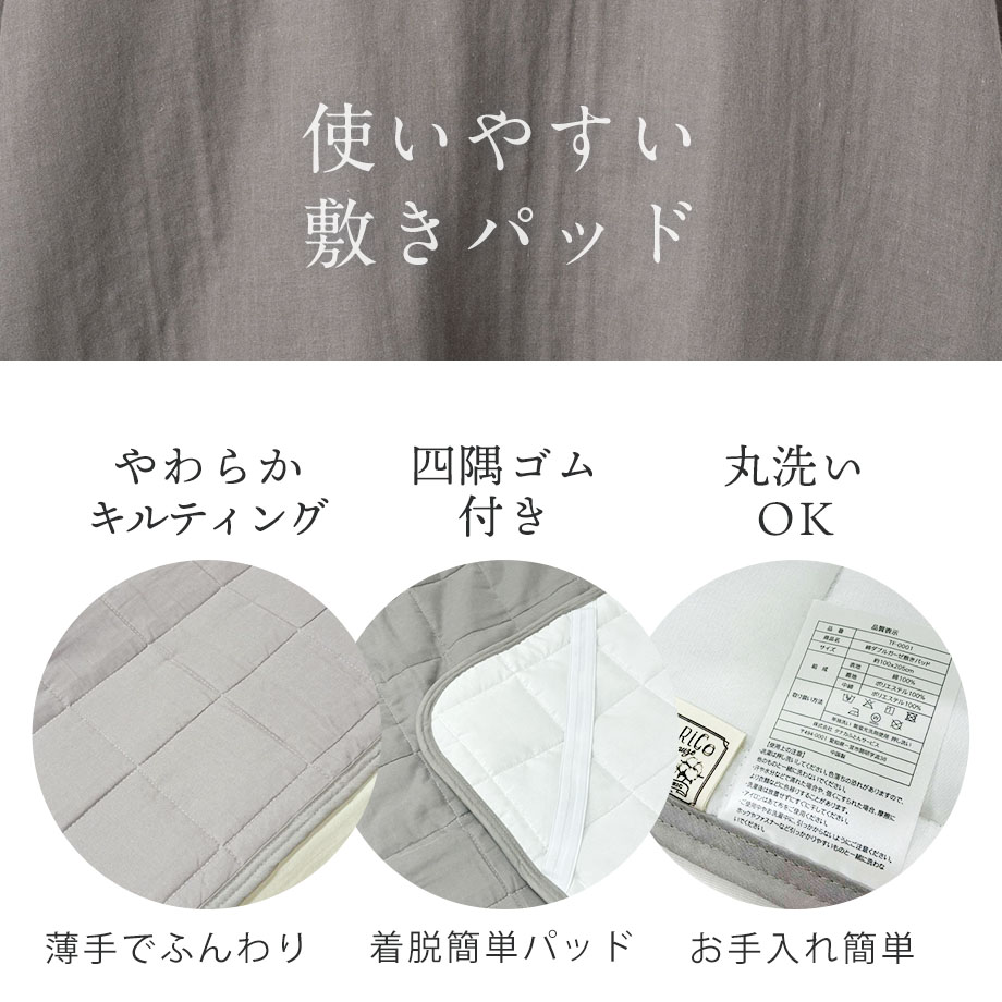 商品仕様/ ダブルガーゼ、四辺(枕パッドは両端)ゴム付、取扱い絵表示に従い丸洗い可能