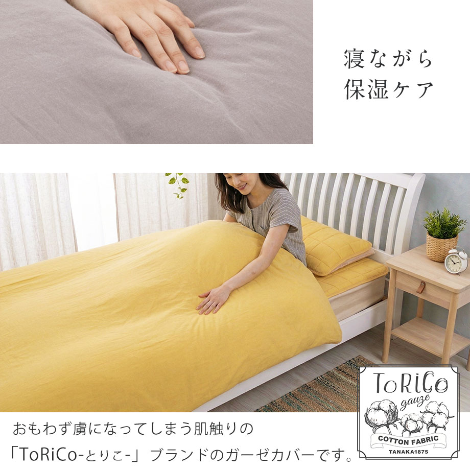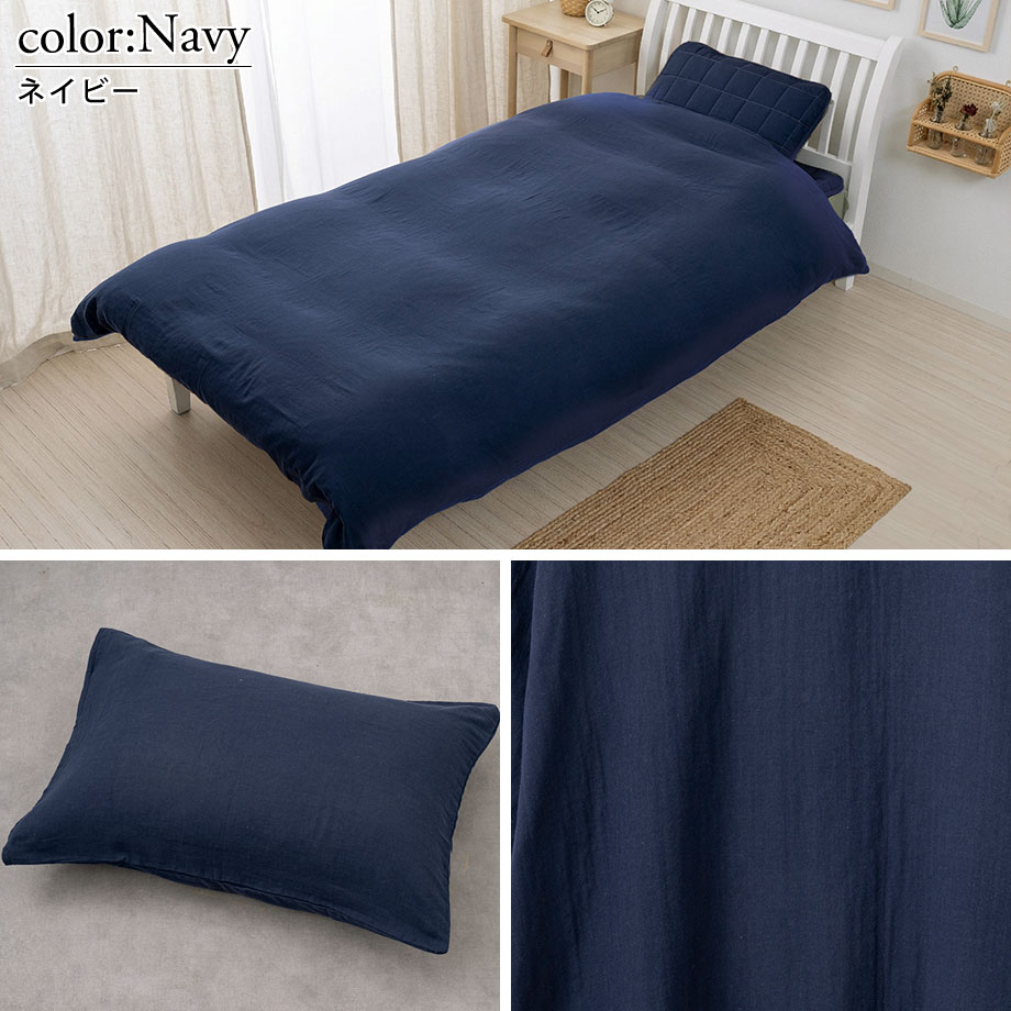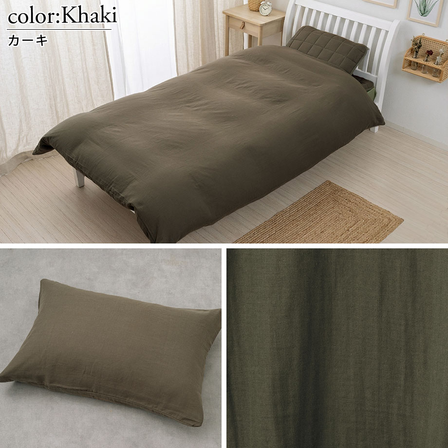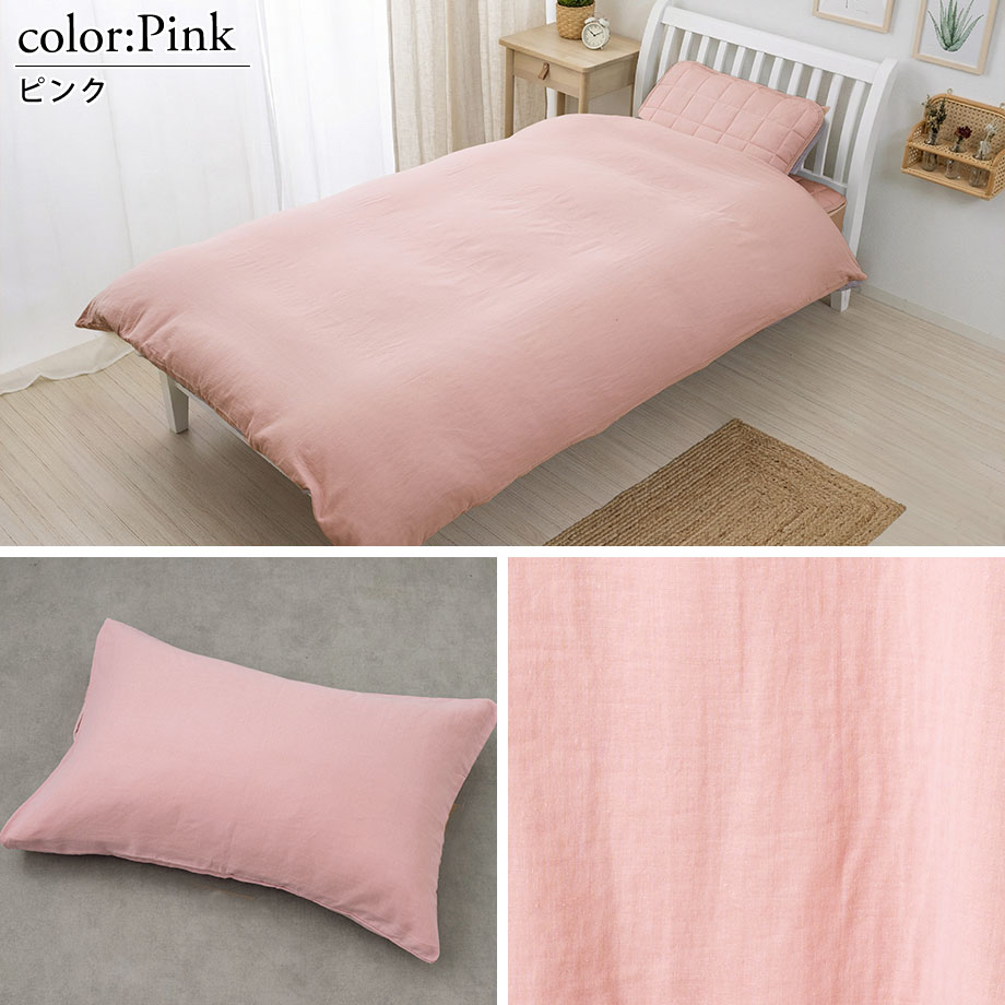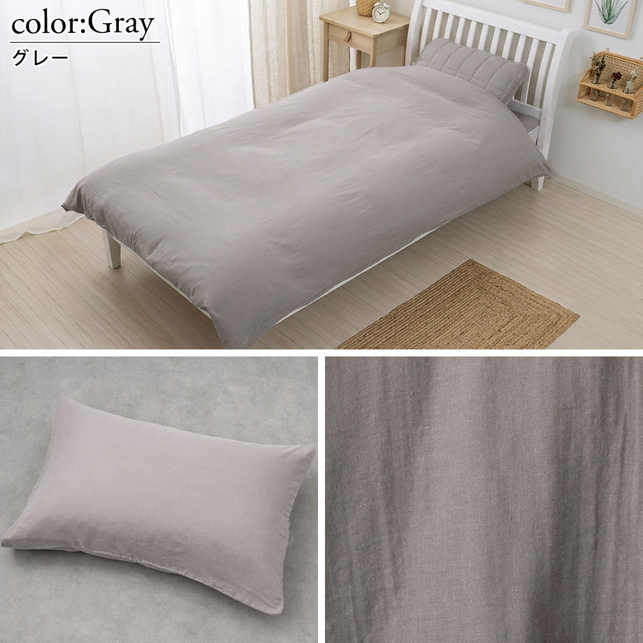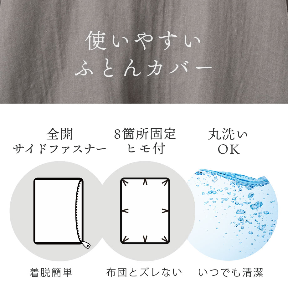 商品仕様/ ダブルガーゼ、8ヶ所ひも付き・全開ファスナー(掛カバー)、中かぶせ式(まくらカバー)、取扱い絵表示に従い丸洗い可能