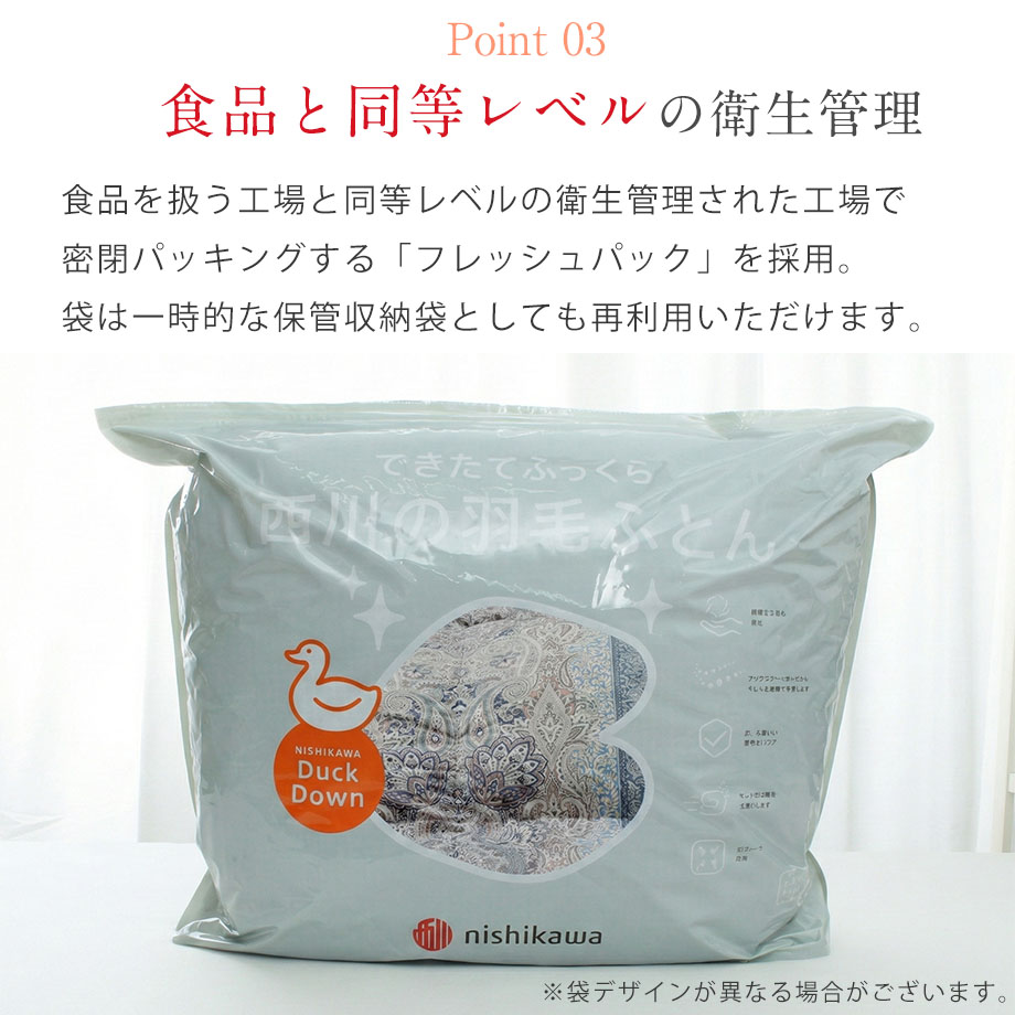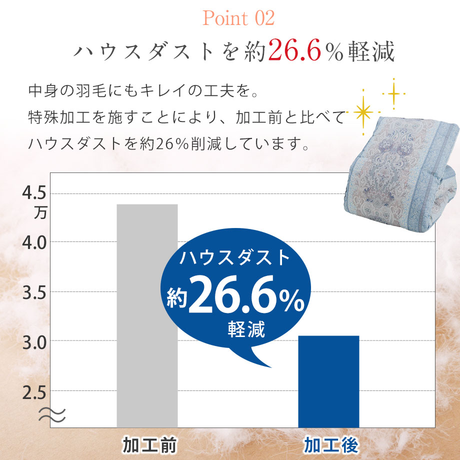 商品仕様/ ハウスダスト軽減(バイオアップ(R)加工により)、二重縫製、ズレ防止ループ8ヶ所あり、フレッシュパック(ソフトバッグ入り)、中わた抗菌