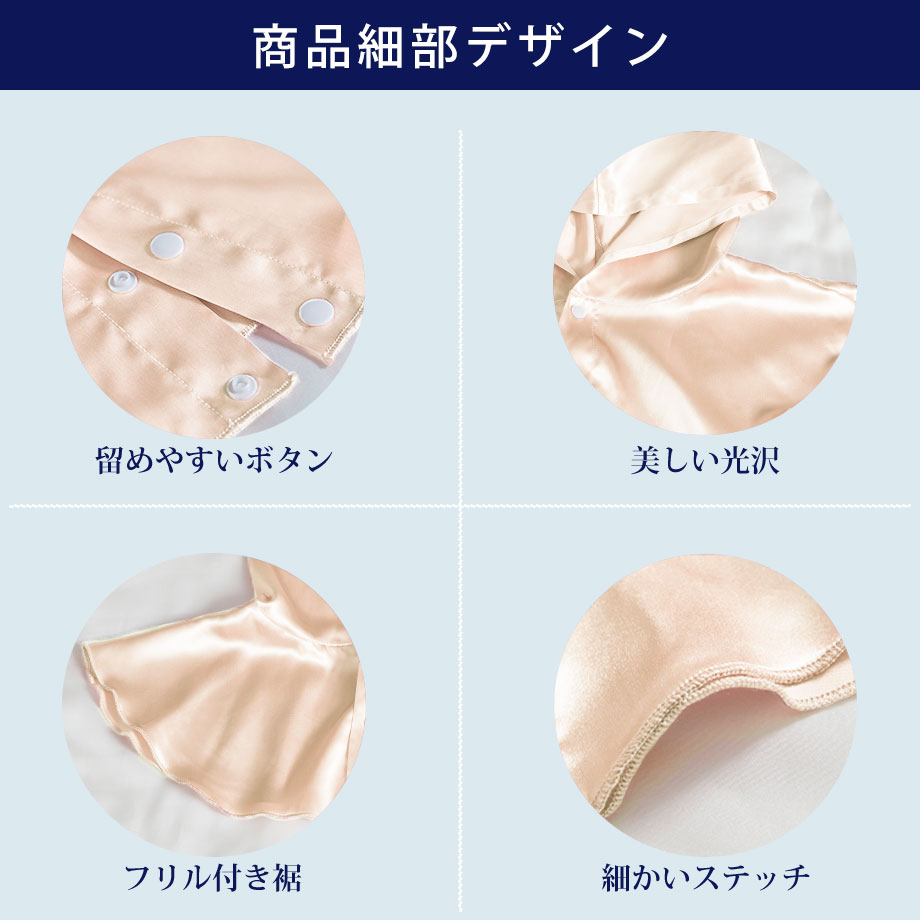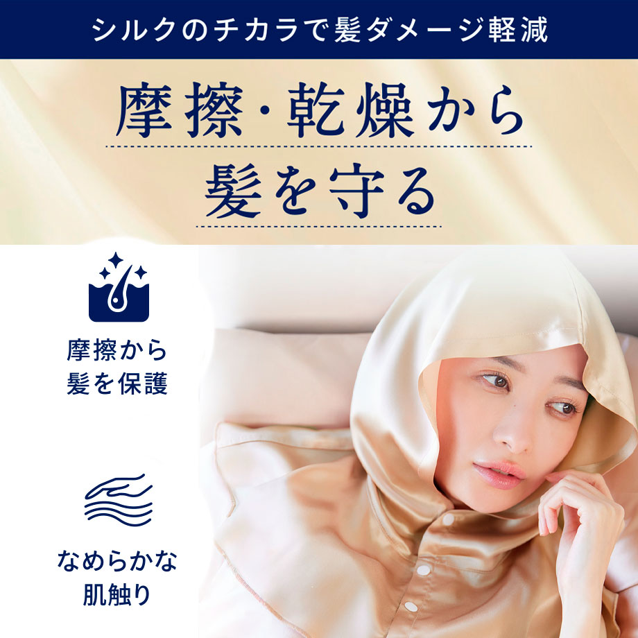 ・ 就寝中の摩擦ダメージを軽減 寝返りによる摩擦を防ぎ、切れ毛や枝毛、抜け毛、白髪の予防に役立ち、髪に自然なツヤとうるおいを与えます。