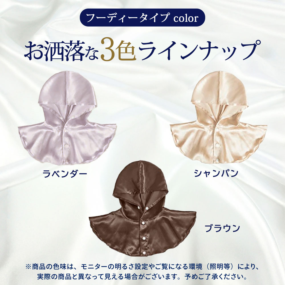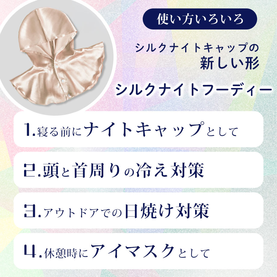 ・ 多目的に使える便利さ ナイトキャップとしてだけでなく、日よけフードやネックウォーマーとしても活用可能な多用途設計。目まで隠れるため、アイマスクとしても使えて心地よい眠りに。
