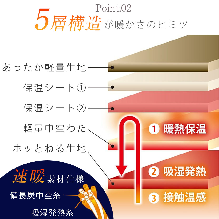 商品仕様/ 吸湿発熱、5層構造、両サイドファスナー、8ヶ所スナップボタン付、衿裏無地面、洗濯表示に従いご家庭で丸洗い可能