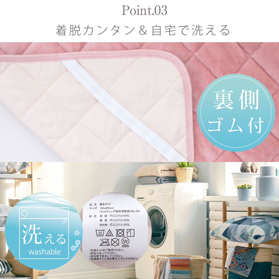 商品仕様/ 裏側ゴム付き、洗濯表示に従い丸洗い可能(ネット使用)