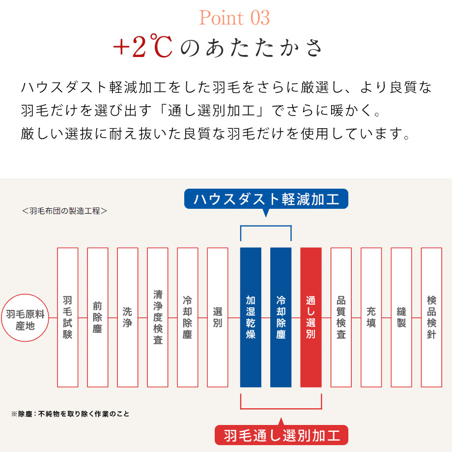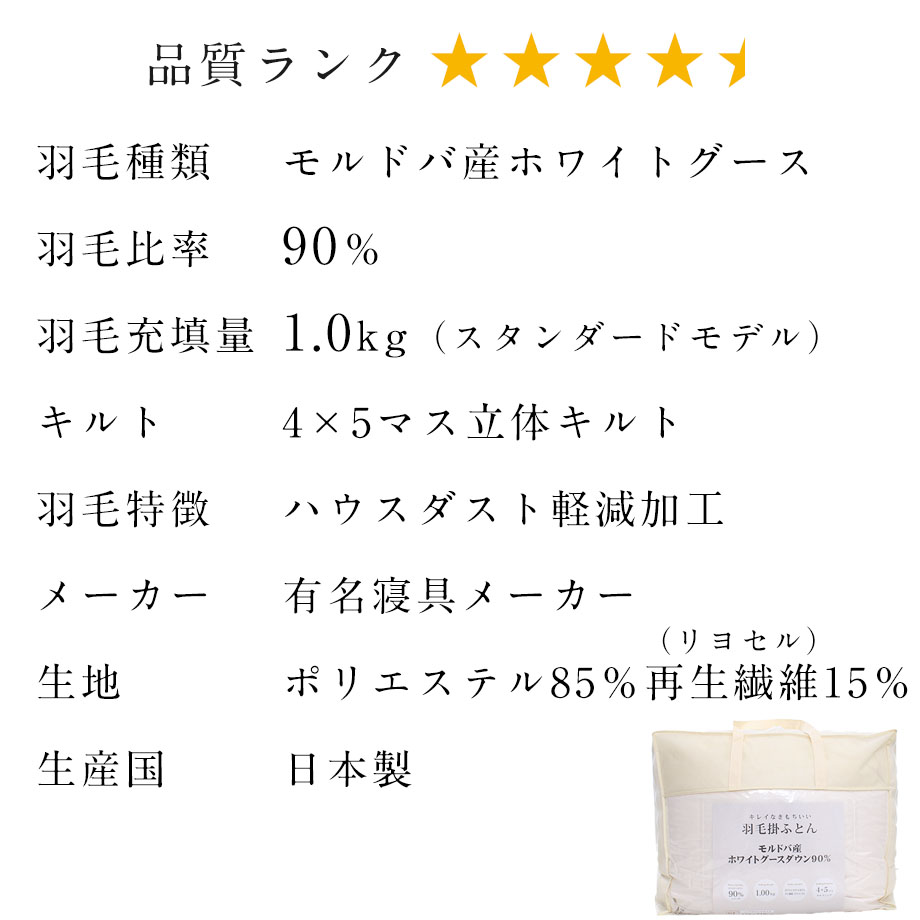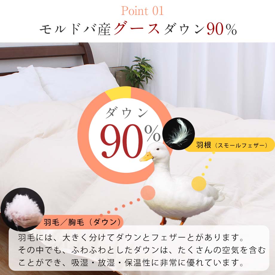 詰め物:モルドバ産グースダウン90%、スモールフェザー10%