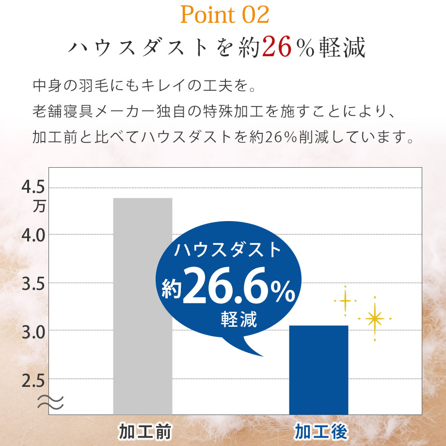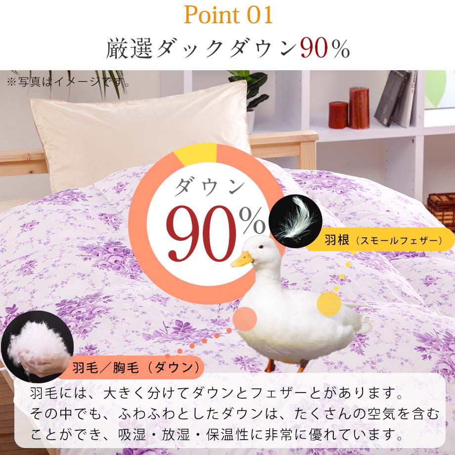 商品仕様/ ハウスダスト軽減加工(羽毛)、二重縫製、ズレ防止ループ8ヶ所あり