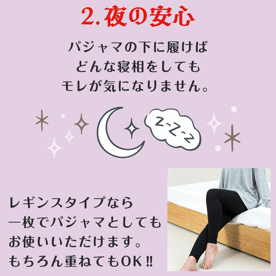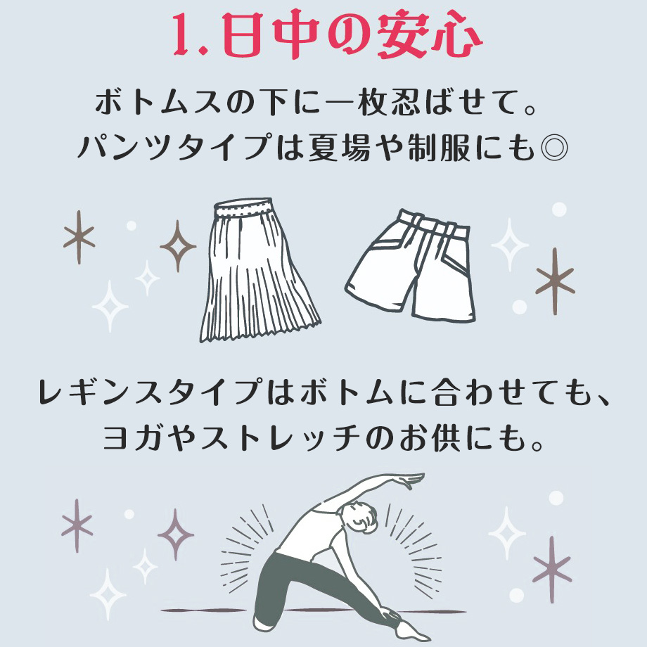 | A:「オーバーパンツ」「オーバーレギンス」ともに、昼夜共通でお使いいただけます。 |