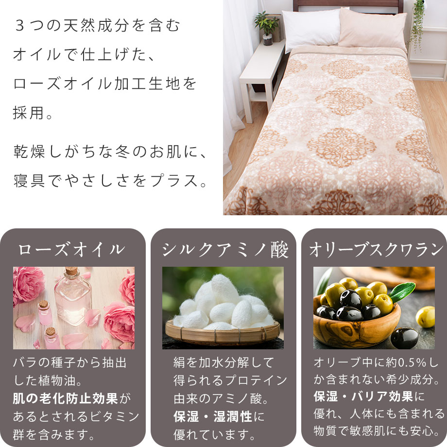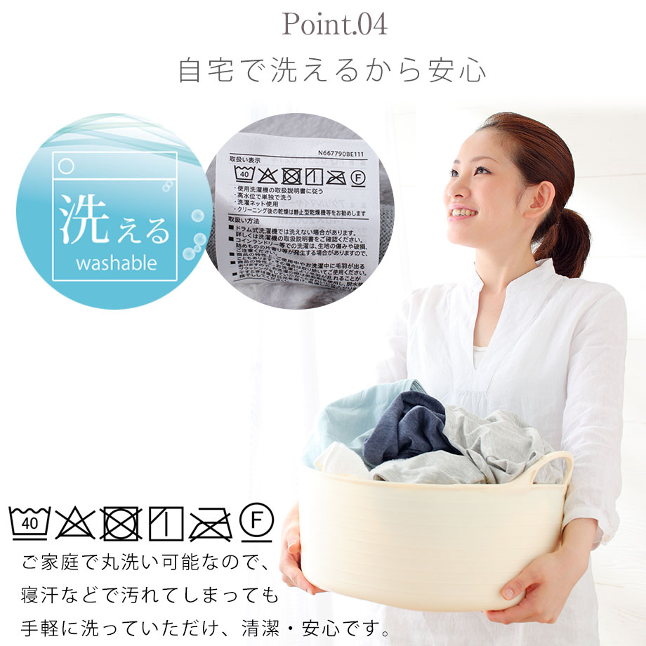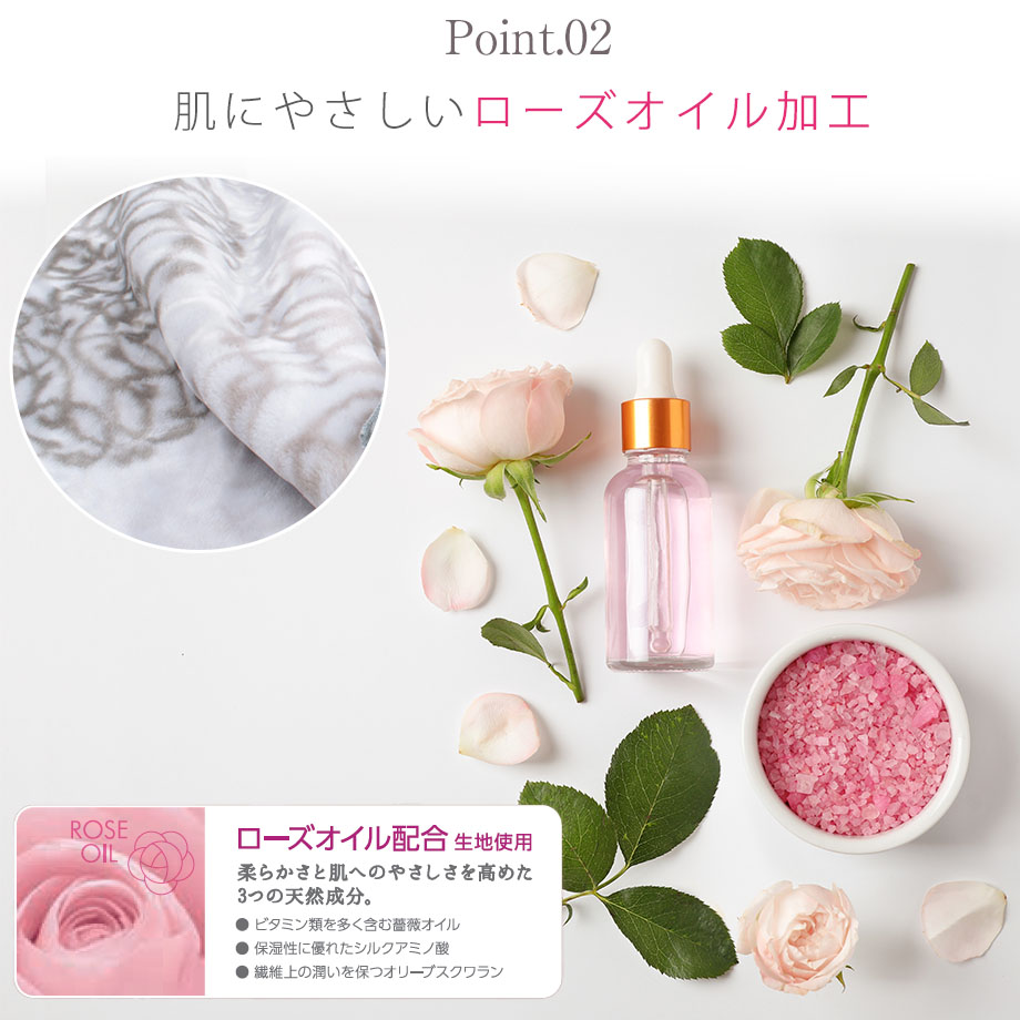 商品仕様/ 繊維にローズオイル配合、抗菌加工(衿裏部分)、静電気抑制、2枚合わせタイプ、衿付、洗濯機で丸洗い可能(ネット使用)