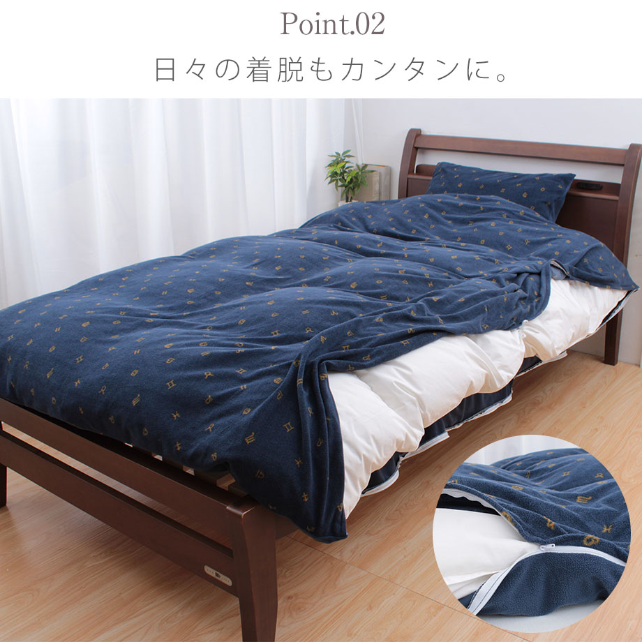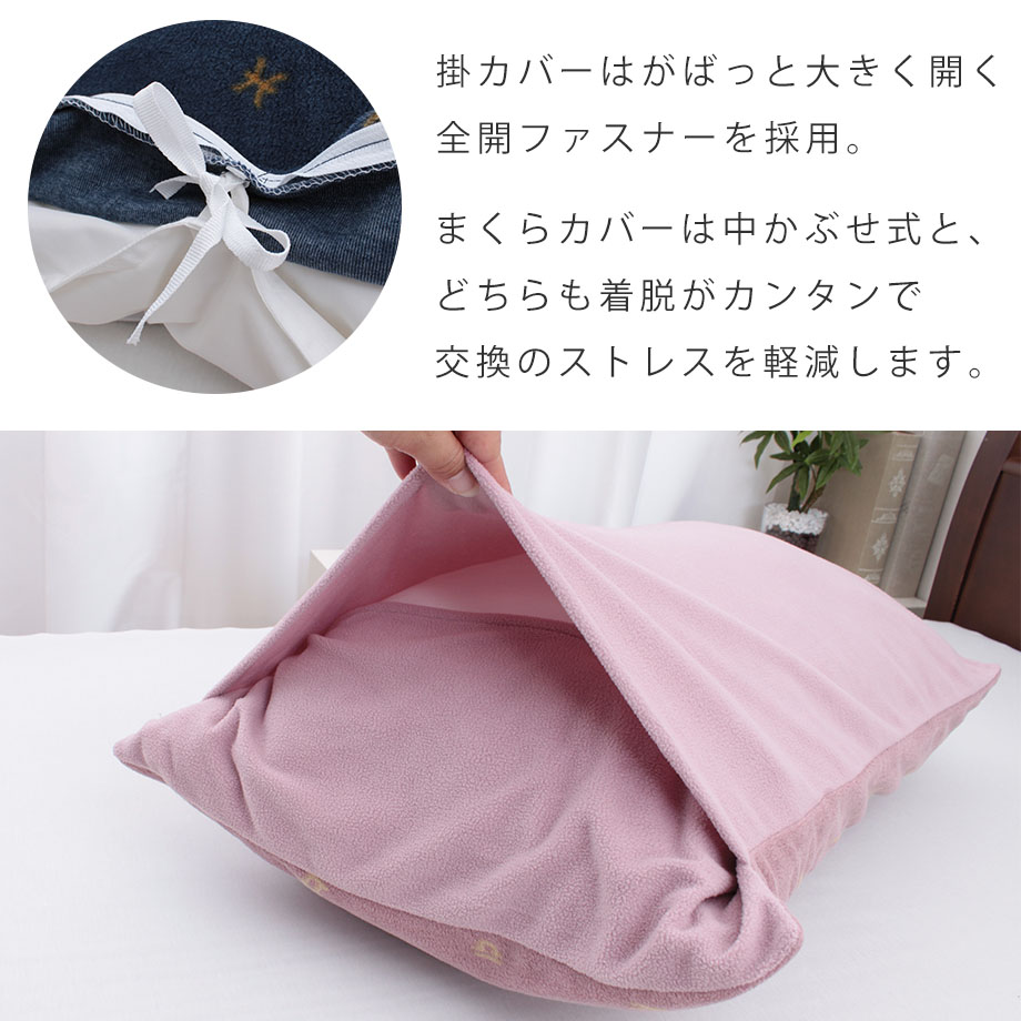 商品仕様/ 8箇所ふとん固定用ヒモ付き(掛カバー)、合わせ式/中かぶせ式(枕カバー)、洗濯表示に従い丸洗い可能(ネット使用)