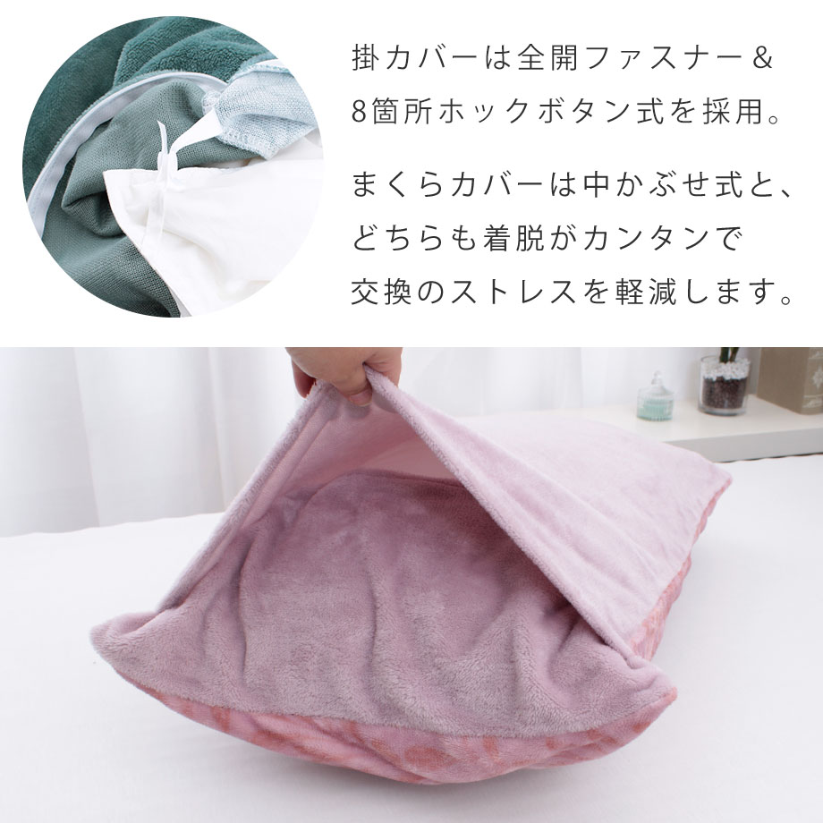 商品仕様/ 8箇所ホックボタン式ふとん固定用ヒモ付き(掛カバー)、合わせ式/中かぶせ式(枕カバー)、洗濯表示に従い丸洗い可能(ネット使用)