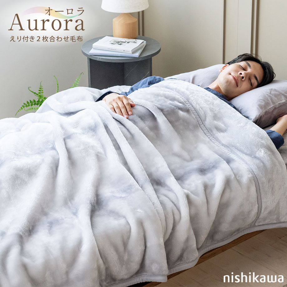 西川 2枚合わせ毛布 シングル オーロラ柄 ドットブロック柄